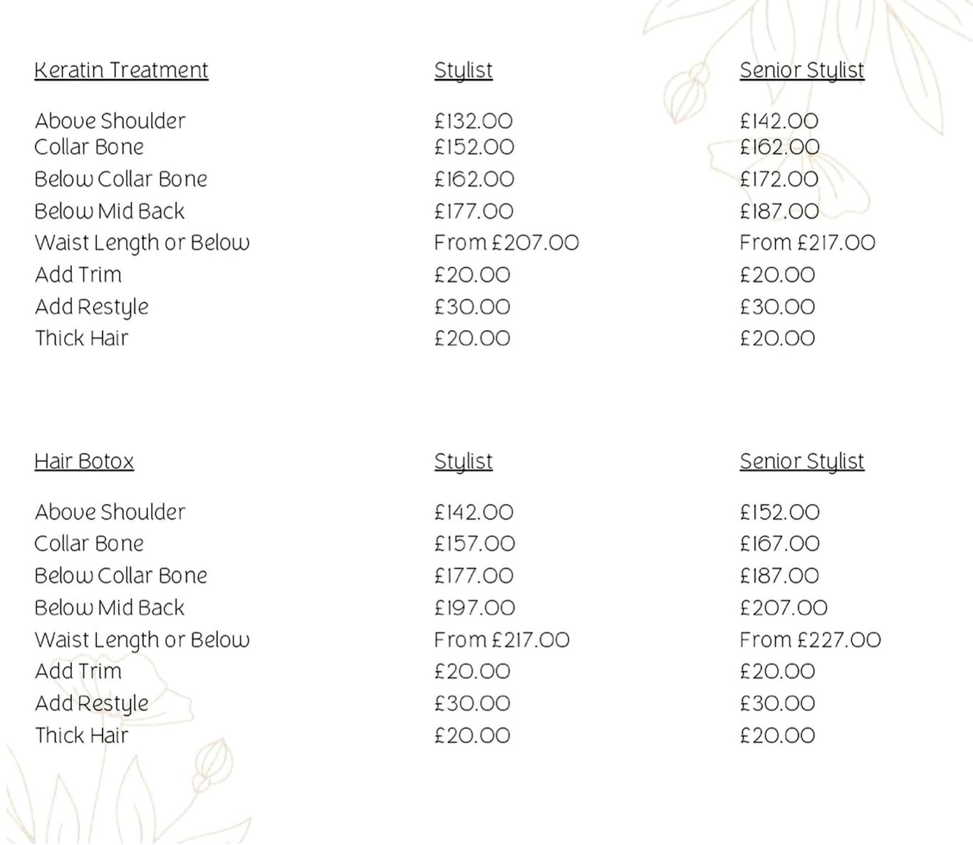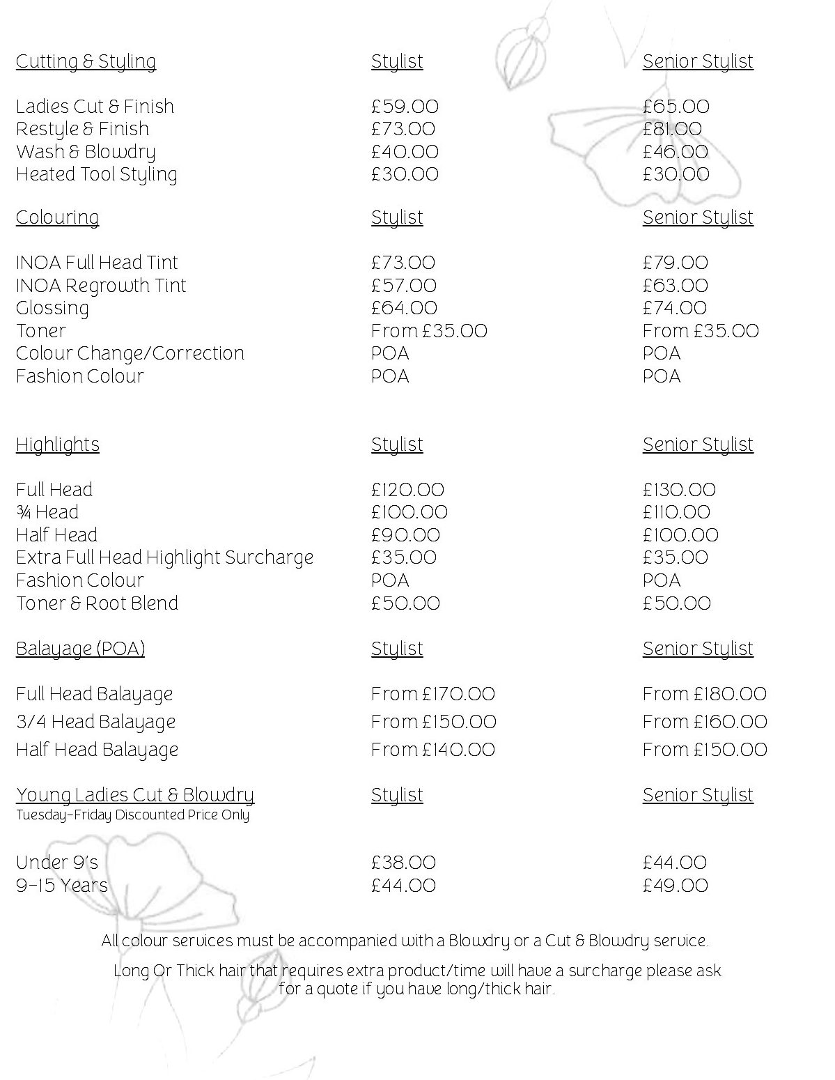 • Booking & Holding Fee: To secure your appointment, we require a 25% holding fee, which will be deducted from your final bill. The remainder of your payment will be due in the salon, which can be made by cash or card.